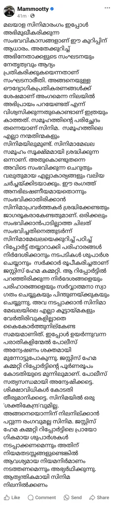 ഹേമ കമ്മിറ്റി റിപ്പോര്ട്ടിലും തുടര്ന്ന് സിനിമ രംഗത്തുണ്ടായ വിവാദങ്ങളിലും ആദ്യമായി പ്രതികരിച്ച് നടൻ മമ്മൂട്ടി.സിനിമയില് ഒരു ശക്തികേന്ദ്രവുമില്ലെന്നും ഹേമ കമ്മിറ്റി റിപ്പോർട്ടില് പറഞ്ഞിരിക്കുന്ന നിർദേശങ്ങളെയും പരിഹാരങ്ങളെയും സർവാത്മനാ സ്വാഗതം ചെയ്യുകയും പിന്തുണക്കുന്നതായും താരം ഫേസ്ബുക്കില് കുറിച്ചു.മലയാള സിനിമാരംഗം ഇപ്പോള് അഭിമുഖീകരിക്കുന്ന സംഭവവികാസങ്ങളാണ് ഈ കുറിപ്പിന് ആധാരം എന്നു പറഞ്ഞാണ് താരത്തിന്റെ ഫേസ്ബുക്ക് കുറിപ്പ് ആരംഭിക്കുന്നത്. ഔദ്യോഗിക പ്രതികരണങ്ങള്ക്ക് കാത്തുനിന്നതിനാലാണ് തന്റെ പ്രതികരണം വൈകിയത്. സമൂഹത്തിന്റെ പരിച്ഛേദം തന്നെയാണ് സിനിമ. സമൂഹത്തിലെ എല്ലാ നന്മതിന്മകളും സിനിമയിലുമുണ്ട്. സിനിമാമേഖല സമൂഹം സൂക്ഷ്മമായി ശ്രദ്ധിക്കുന്ന ഒന്നാണ്. അതുകൊണ്ടുതന്നെ അവിടെ സംഭവിക്കുന്ന ചെറുതും വലുതുമായ എല്ലാകാര്യങ്ങളും വലിയ ചർച്ചക്കിടയാക്കുമെന്നും കുറിപ്പില് പറയുന്നു.ഉയർന്നുവന്ന പരാതികളിന്മേല് പൊലീസ് അന്വേഷണം ശക്തമായി മുന്നോട്ടുപോകുന്നു. ജസ്റ്റിസ് ഹേമ കമ്മറ്റി റിപ്പോർട്ടിന്റെ പൂർണരൂപം കോടതിയുടെ മുന്നിലുമാണ്. പൊലീസ് സത്യസന്ധമായി അന്വേഷിക്കട്ടെ. ശിക്ഷാവിധികള് കോടതി തീരുമാനിക്കട്ടെ. ഹേമ കമ്മിറ്റി റിപ്പോർട്ടിലെ പ്രായോഗികമായ ശുപാർശകള് നടപ്പാക്കണമെന്നും അതിന് നിയമതടസ്സങ്ങളുണ്ടെങ്കില് ആവശ്യമായ നിയമനിർമാണം നടത്തണമെന്നും അദ്ദേഹം വ്യക്തമാക്കി.
