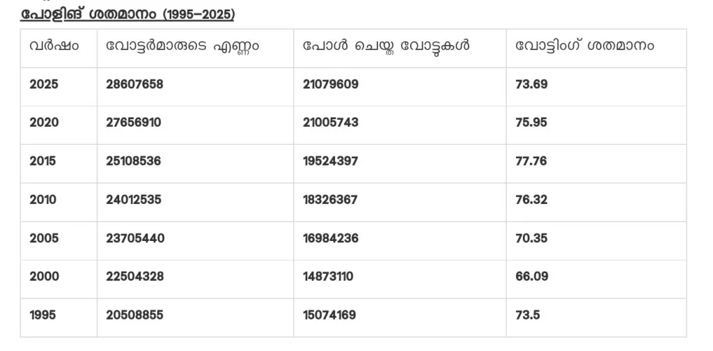 1993 – ൽ കേരള സംസ്ഥാന തിരഞ്ഞെടുപ്പ് കമ്മീഷൻ നിലവിൽ വന്നതിനുശേഷം 1995 ൽ നടന്ന ആദ്യ തദ്ദേശ സ്വയംഭരണ പൊതുതിരഞ്ഞെടുപ്പിൽ 15074169 വോട്ടർമാരാണ് വോട്ട് രേഖപ്പെടുത്തിയത്. 20508855 ആയിരുന്നു അന്നത്തെ വോട്ടർമാരുടെ ആകെ എണ്ണം.