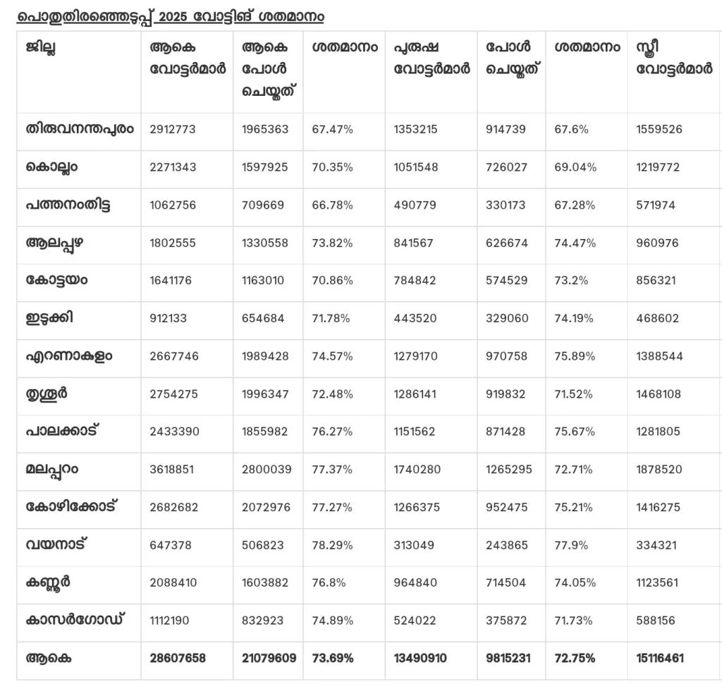 2025 തദ്ദേശ പൊതുതിരഞ്ഞെടുപ്പിൽ ആകെ 73.69 ശതമാനം പോളിംഗ് നടന്നു. തിരുവനന്തപുരം – 67.47%, കൊല്ലം – 70.35%, പത്തനംതിട്ട – 66.78%, ആലപ്പുഴ – 73.82%, കോട്ടയം – 70.86%, ഇടുക്കി – 71.78%, എറണാകുളം – 74.57%, തൃശൂർ – 72.48%, പാലക്കാട് – 76.27%, മലപ്പുറം – 77.37%, കോഴിക്കോട് – 77.27%, വയനാട് – 78.29%, കണ്ണൂർ – 76.77%, കാസർഗോഡ് – 74.89%. എന്നിങ്ങനെയാണ് ജില്ലകളിലെ പോളിങ് ശതമാനം.