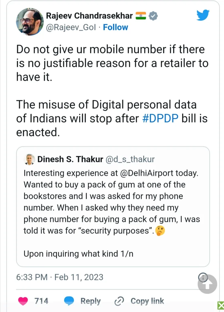 പൊതുജനാരോഗ്യ പ്രവര്ത്തകന് ദിനേഷ് എസ്. ഠാക്കൂറിന്റെ ട്വീറ്റിനോടുള്ള മറുപടിയായാണ് കേന്ദ്രമന്ത്രി ഇക്കാര്യം പറഞ്ഞത്. ഡല്ഹി വിമാനത്താവളത്തിലുണ്ടായ ഒരു അനുഭവമായിരുന്നു ഠാക്കൂര് ട്വീറ്റില് പങ്കുവെച്ചിരുന്നത്.വിമാനത്താവളത്തിലെ ഒരു കടയില്നിന്ന് ഒരു പാക്കറ്റ് ച്യൂയിങ് ഗം വാങ്ങാന് പോയപ്പോള് അവര് തന്റെ മൊബൈല് നമ്പര് ആരാഞ്ഞുവെന്നും എന്തിനാണെന്ന് ചോദിച്ചപ്പോള് സുരക്ഷാകാരണങ്ങള് മുന്നിര്ത്തിയാണെന്ന് മറുപടി നല്കിയെന്നും ഠാക്കൂര് ട്വീറ്റില് പറയുന്നു. തുടര്ന്ന് താന് ച്യൂയിങ് ഗം വാങ്ങാതെ മടങ്ങിയെന്നും ഠാക്കൂര് ട്വീറ്റില് പറഞ്ഞിരുന്നു.