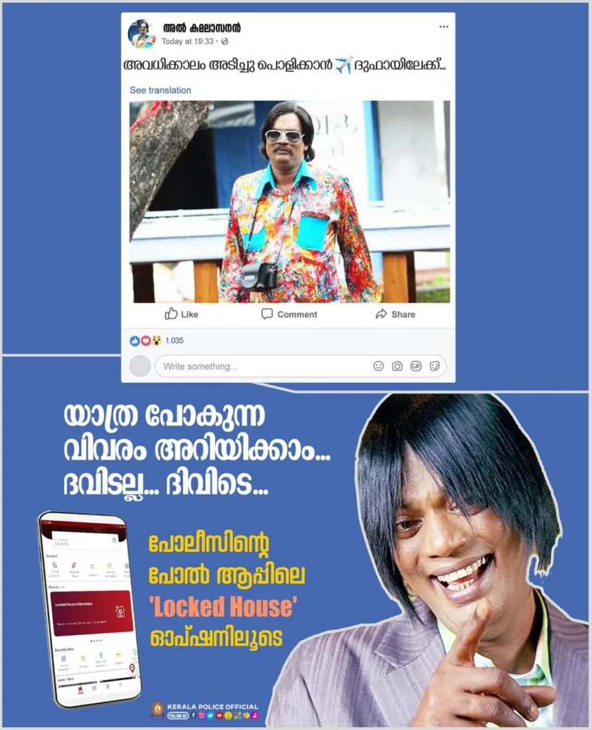അവധിക്കാലമാണ്. വീട് പൂട്ടി ഉല്ലാസയാത്ര പോകുന്ന വിവരം സോഷ്യൽ മീഡിയ വഴി പരസ്യമാക്കുന്നത് അത്ര സുരക്ഷിതമല്ല. വീട് പൂട്ടി യാത്ര പോകുമ്പോൾ നിങ്ങൾക്ക് ആ വിവരം അടുത്തുള്ള പോലീസ് സ്റ്റേഷനിൽ അറിയിക്കാം. വീട് സ്ഥിതി ചെയ്യുന്ന ഭാഗങ്ങളിൽ പോലീസ് പ്രത്യേക നിരീക്ഷണം നടത്തും. അതിനായി പോലീസിന്റെ ഔദ്യോഗിക മൊബൈൽ ആപ്പ് ആയ പോൽ ആപ്പിലെ ‘Locked House’ സൗകര്യം വിനിയോഗിക്കാം.കൂടാതെ ഇക്കാര്യങ്ങളും ശ്രദ്ധിക്കുക…
