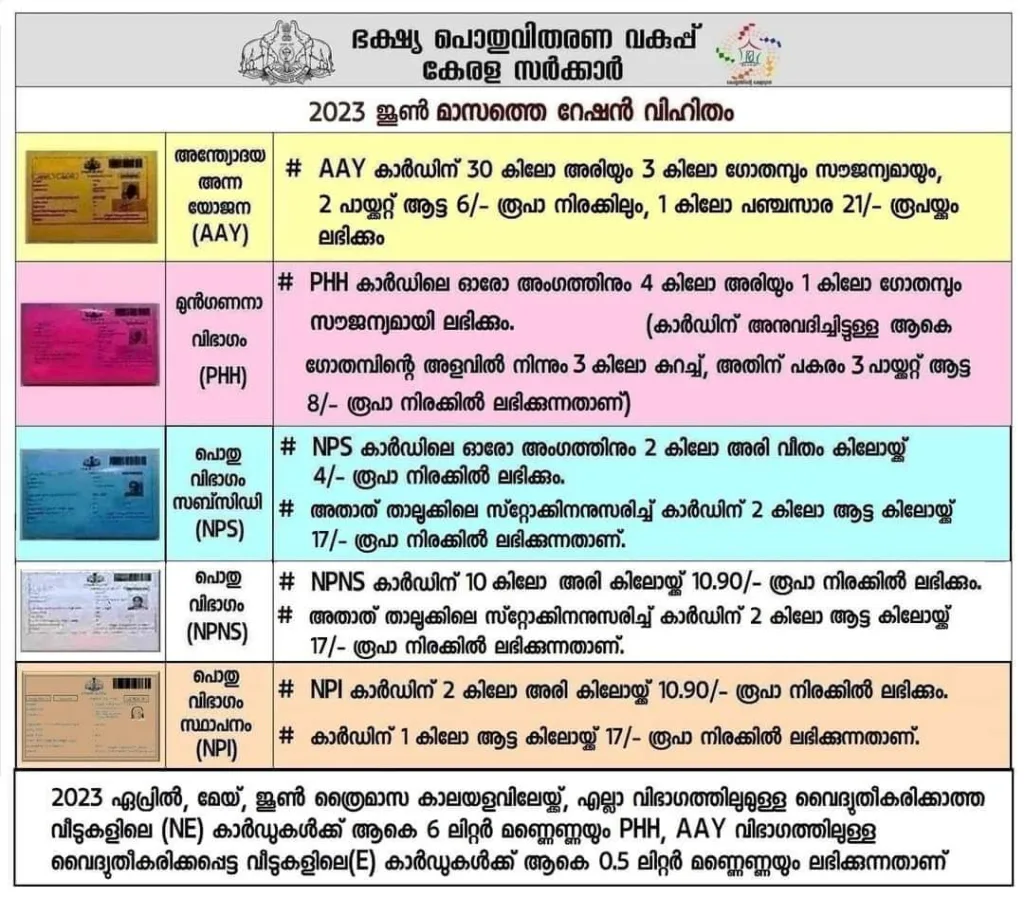 3. എല്ലാ വിഭാഗം റേഷൻ കാർഡുകൾക്കും അനുവദിച്ചിട്ടുള്ള, 2023 ജൂൺ മാസത്തെ റേഷൻ വിഹിതം ചുവടെ ചേർക്കുന്നു…