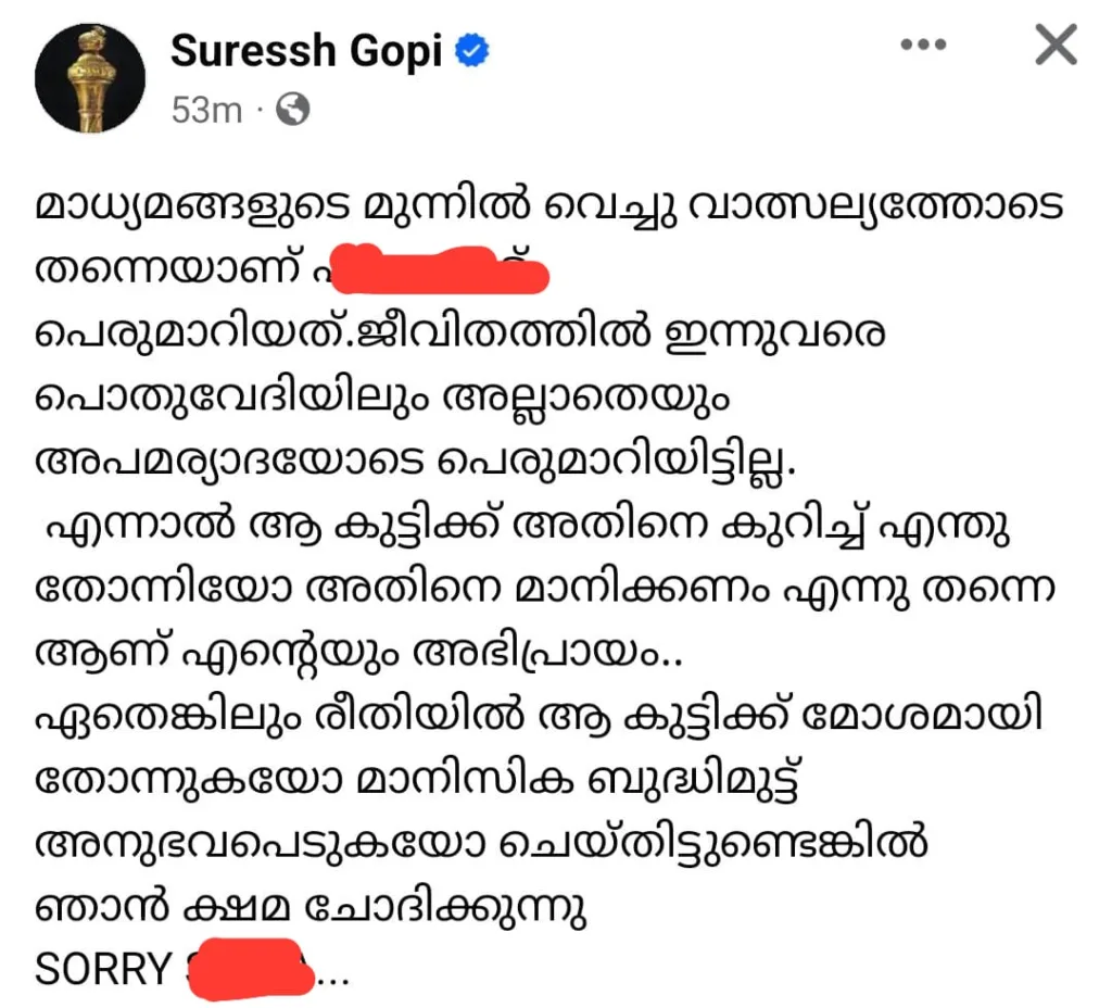 കോഴിക്കോട്: വനിതാ മാധ്യമപ്രവര്ത്തകയോട് അപര്യാദയായി പെരുമാറിയ സംഭവത്തില് മാപ്പു ചോദിച്ച് നടനും ബി.ജെ.പി നേതാവുമായ സുരേഷ് ഗോപി. മാധ്യമങ്ങളുടെ മുന്നിൽ വെച്ചു വാത്സല്യത്തോടെ തന്നെയാണ് പെരുമാറിയതെന്നും ഏതെങ്കിലും രീതിയിൽ ആ കുട്ടിക്ക് മോശമായി തോന്നുകയോ മാനസിക ബുദ്ധിമുട്ട് അനുഭവപെടുകയോ ചെയ്തിട്ടുണ്ടെങ്കിൽ താൻ ക്ഷമ ചോദിക്കുന്നതായും സുരേഷ് ഗോപി ഫേസ്ബുക്കില് കുറിച്ചു.